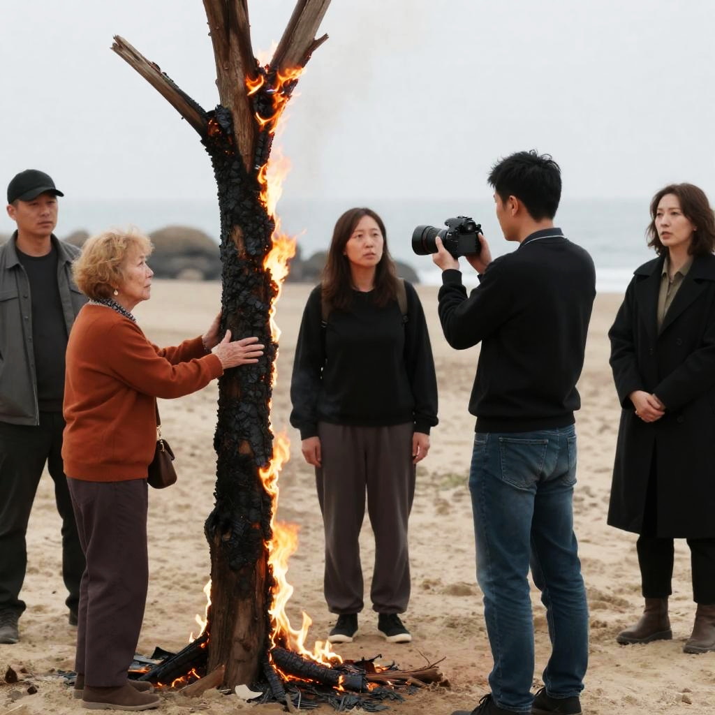 Photograph of a film set. A burning tree trunk center-left. Six people: elderly woman in orange sweater and short blonde hair, middle-aged woman in black top and grey pants, Asian man in black sweater and jeans holding camera, standing man in grey jacket, woman in black coat, man in grey jacket and hat. Beach background with rocks. Man in black sweater taking a photo. Elderly woman touching tree. Middle-aged woman standing beside elderly woman. Burnt tree trunk on left. People's expressions neutral or focused.