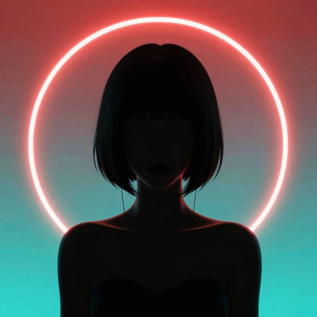 This digital art piece features a shadowy, faceless figure with a sleek, black bob haircut, standing in front of a glowing, neon circle. The background has a gradient from red to turquoise, adding a sci-fi vibe. The figure's silhouette is outlined by the bright neon light, creating a mysterious and futuristic atmosphere. Thin lines descend from the figure's chin, adding an enigmatic touch.