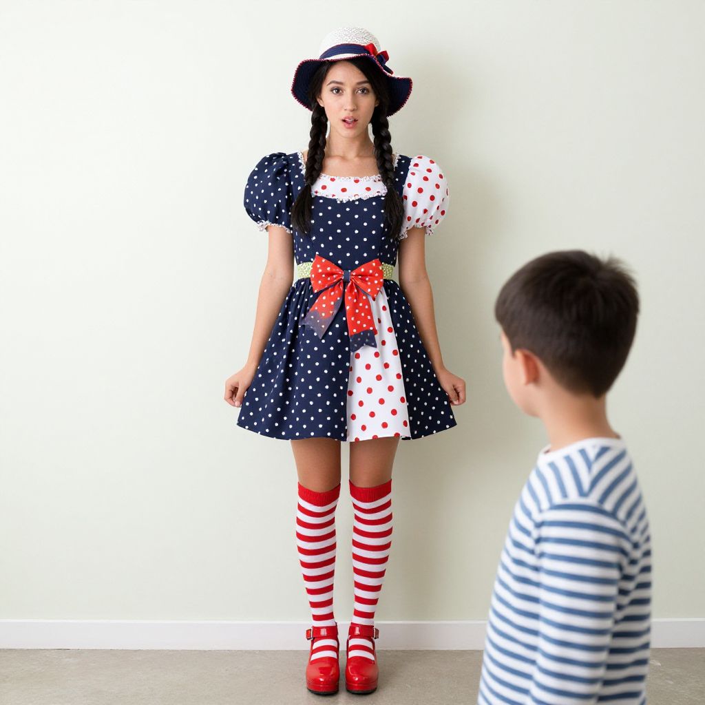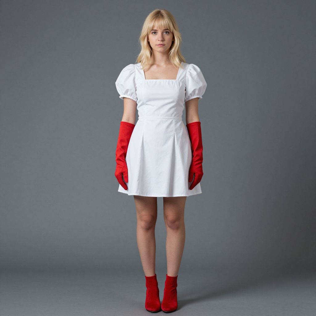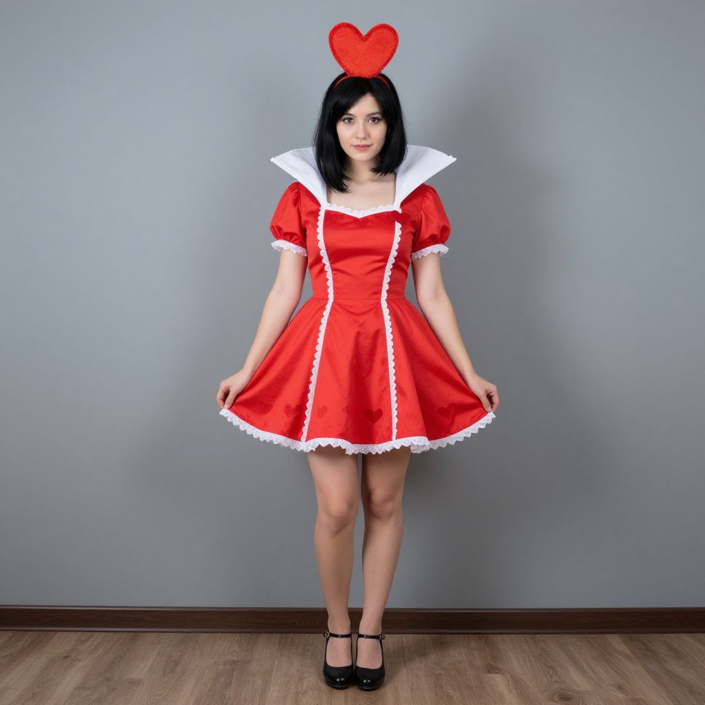 "female fancy dress costume, dress, 1girl, solo, red dress, standing, long sleeves, hat, full body, puffy sleeves, brown hair, juliet sleeves, apron, long hair, frills, parody, hat flower, closed mouth, flower, black footwear Realistic photo of casual sexy person with pretty face"