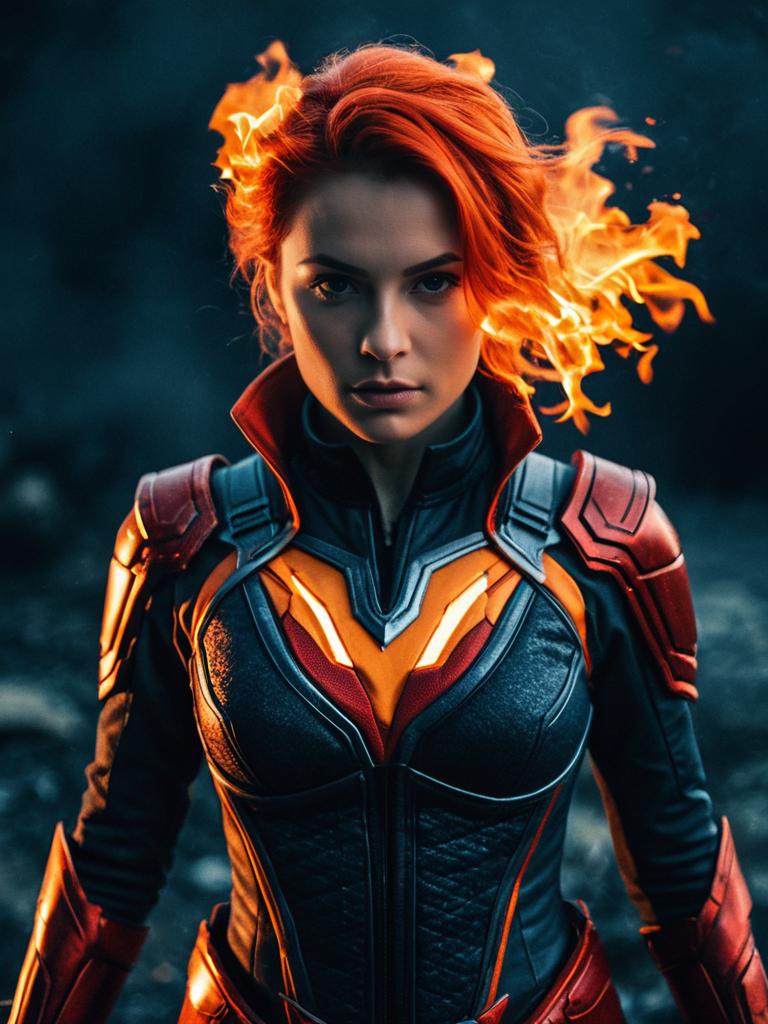 Photograph of a serious woman with fiery red hair ablaze at the top, set against a dark background. She wears a tight, glossy black and red leather-like suit with intricate patterns. Her intense eyes are illuminated by the fire, highlighting her determined expression. The suit has a high collar and straps, adding to the edgy, superhero-like appearance. The image is highly dramatic, with vivid contrasts between the bright flames and dark surroundings, emphasizing her powerful presence. The overall style is cinematic and action-oriented.
