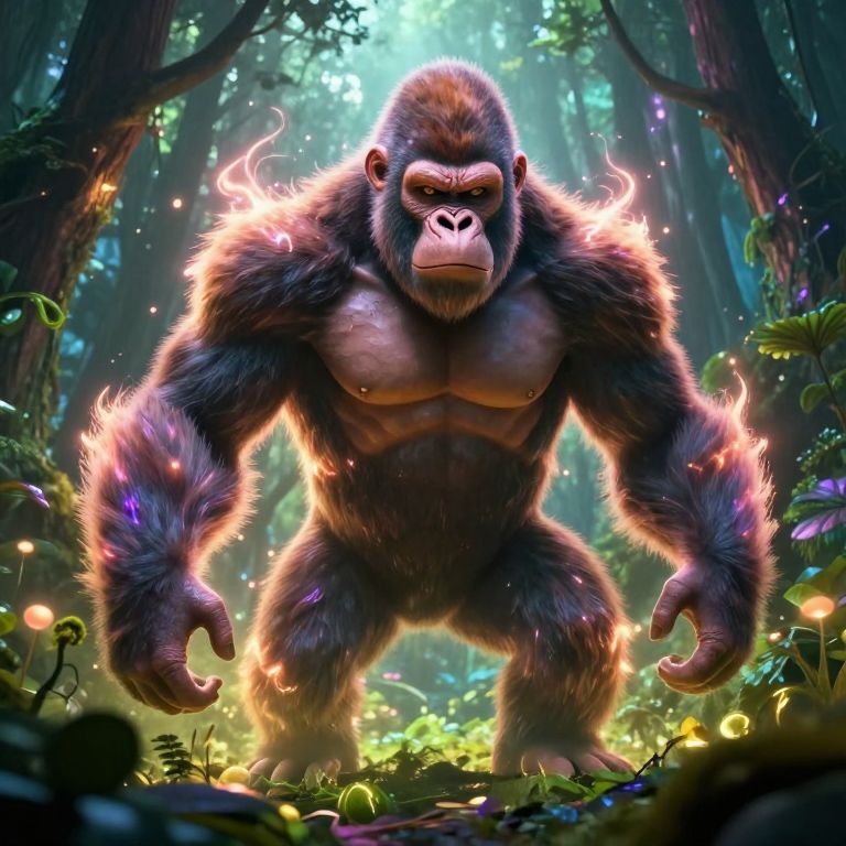 Uzaru colossal ape form in a mystic forest with glowing flora, energy aura radiating, muscular figure with detailed fur and fierce visage, magical atmosphere, soft glowing lights and shadows, vibrant and immersive fantasy illustration.