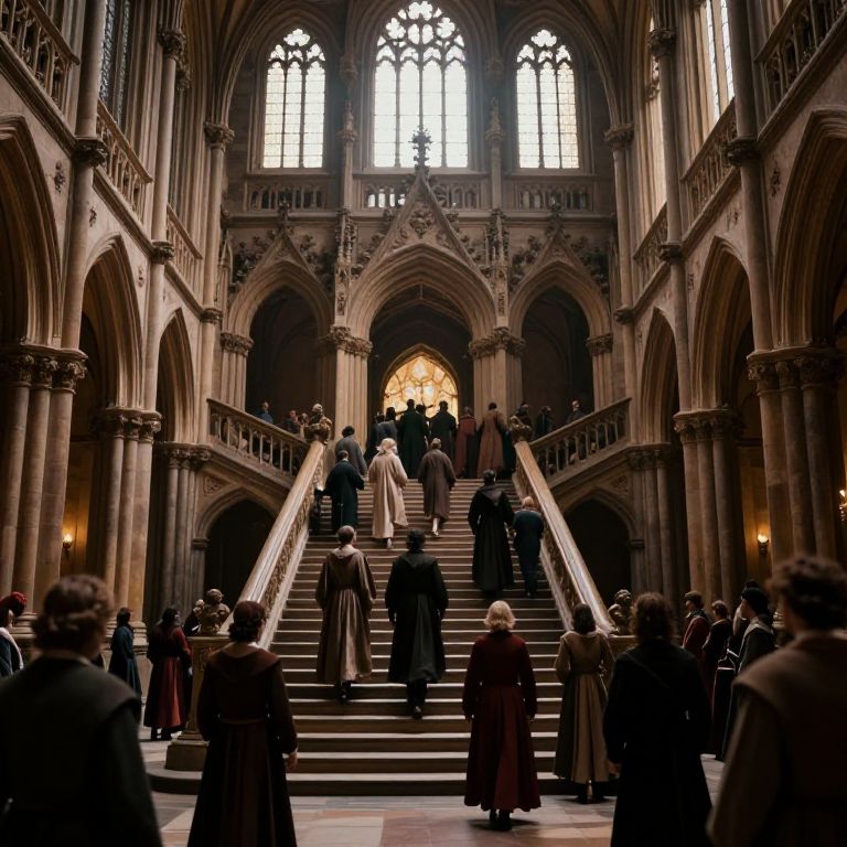 The image depicts a grand, Gothic-style palace with a deep, rich color palette dominated by warm browns and earth tones. The architecture features intricate details, including arched doorways, ornate columns, and elaborate carvings. A crowd of people, dressed in medieval garb, fills the grand staircase, ascending and descending in a bustling, yet orderly manner. The lighting is dramatic, with a soft, dreamy quality that filters through the high, arched windows, casting a warm glow over the scene. The depth of field is shallow, with the foreground and background slightly blurred, drawing the viewer's attention to the central staircase and the people within. The overall composition is balanced, with the staircase serving as a central axis that guides the eye through the image, creating a sense of movement and depth. The scene is hyperdetailed, with every element, from the textures of the clothing to the intricate carvings on the columns, meticulously rendered. The image is a cinematic dream, with a sense of grandeur and mystery that transports the viewer to a world of fantasy and history.