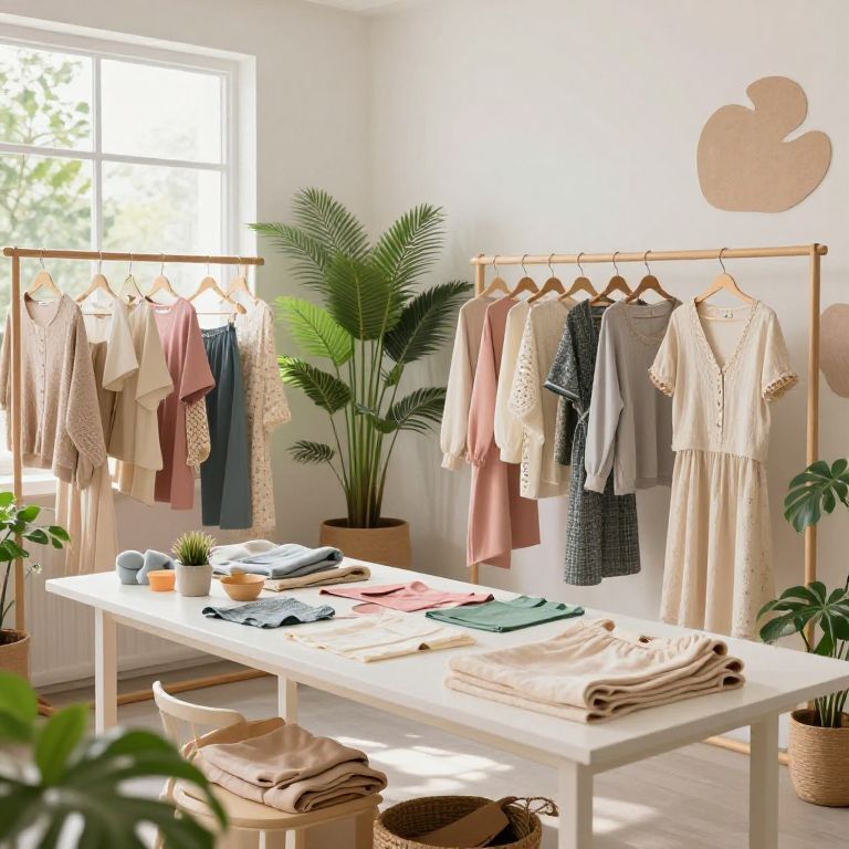Design clothes for free as an eco-friendly fashion lab, designers crafting clothes from sustainable materials, natural fibers and recycled textiles, surrounded by plants and organic shapes, soft pastel hues, light-filled eco space, demonstrating innovation and conscious creativity