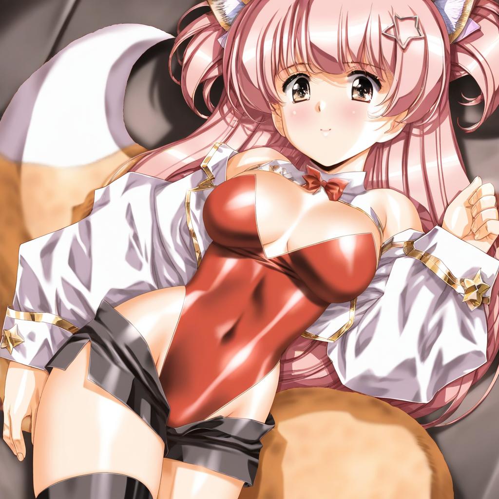 Annytf, indie virtual youtuber, 1girl, fox girl, fox ears, fox tail, animal ear fluff, brown eyes, purple eyes, long hair, brown hair, pink hair, star hair ornament, medium breasts, large breasts, cleavage, thighs, highleg leotard, red leotard, leotard under clothes, black thighhighs, long sleeves, bare shoulders, virtual youtuber, virtual youtuber, by artist urushihara satoshi, leet