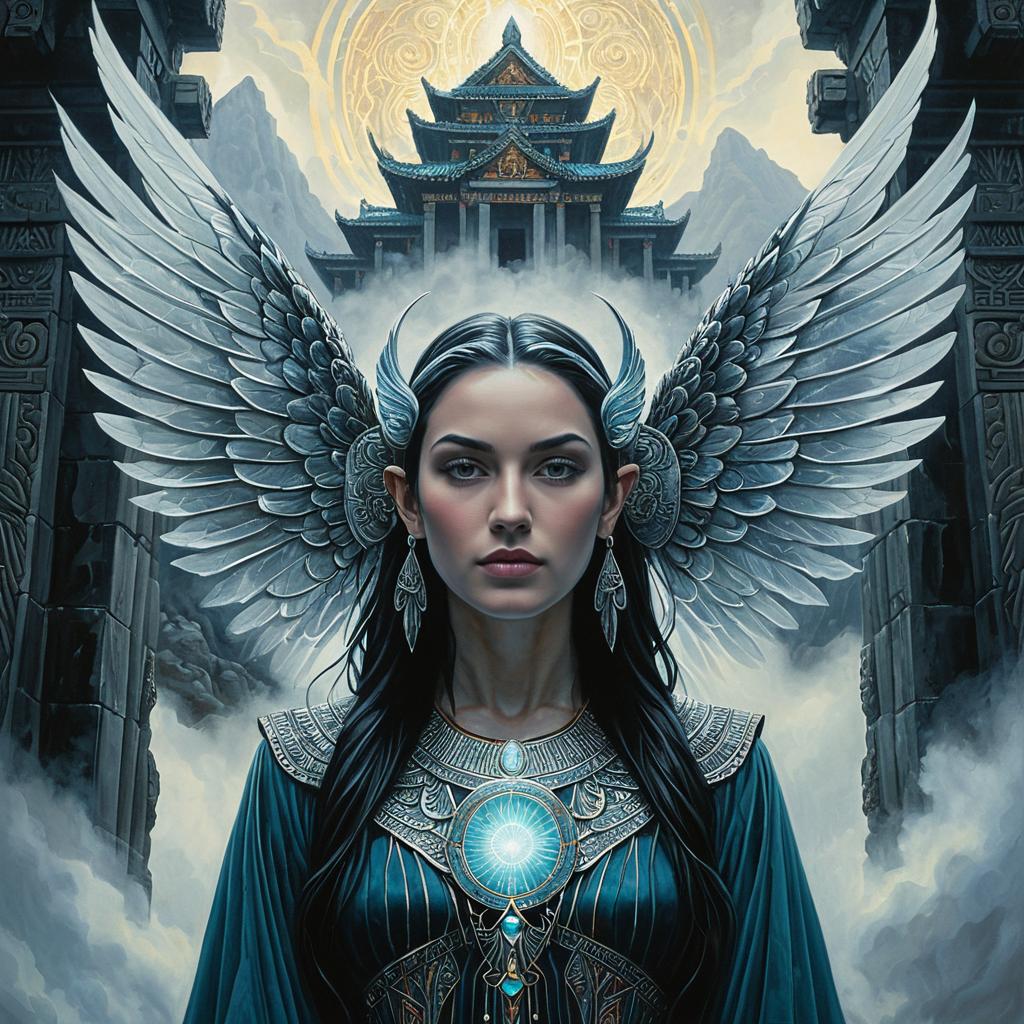 Realistic extremely detailed portrait painting of an ethereal oracle with shimmering metallic wings, set against a mist-covered ancient mountain temple, by Alex Ross, Amanda Sage, James Jean, rendered in rich moody colors and luminous eyes