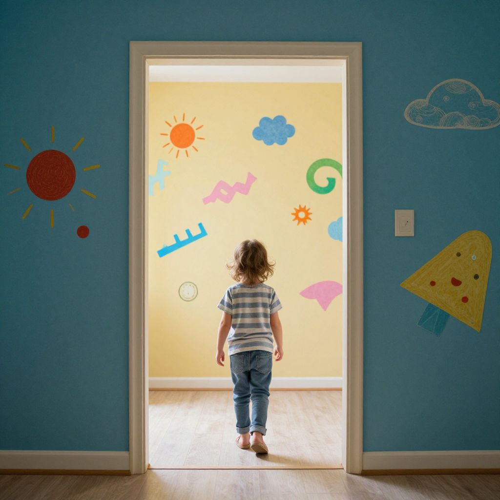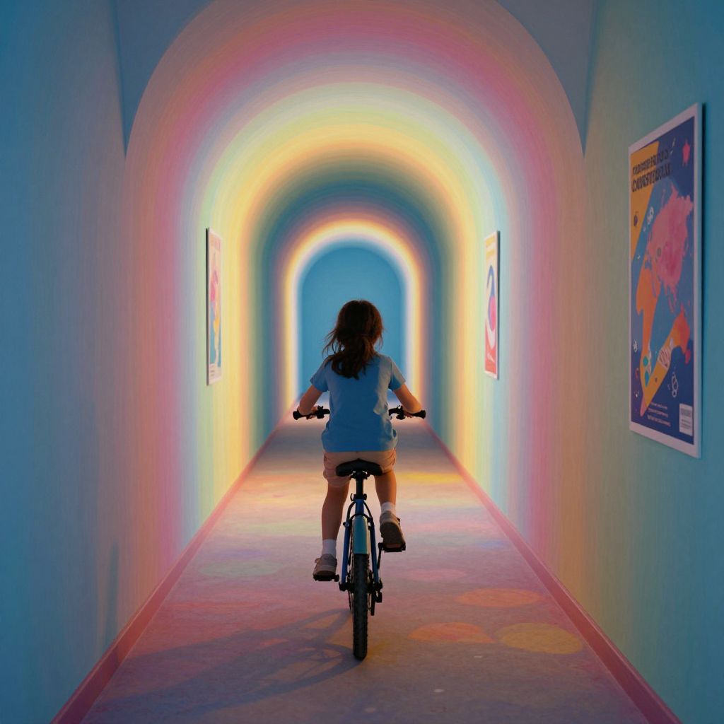 A vibrant digital illustration depicts a child riding a bicycle down a surreal, elongated hallway adorned with orange splatters and posters, where each archway recedes into an impossible depth, hinting at alternate realities beyond.