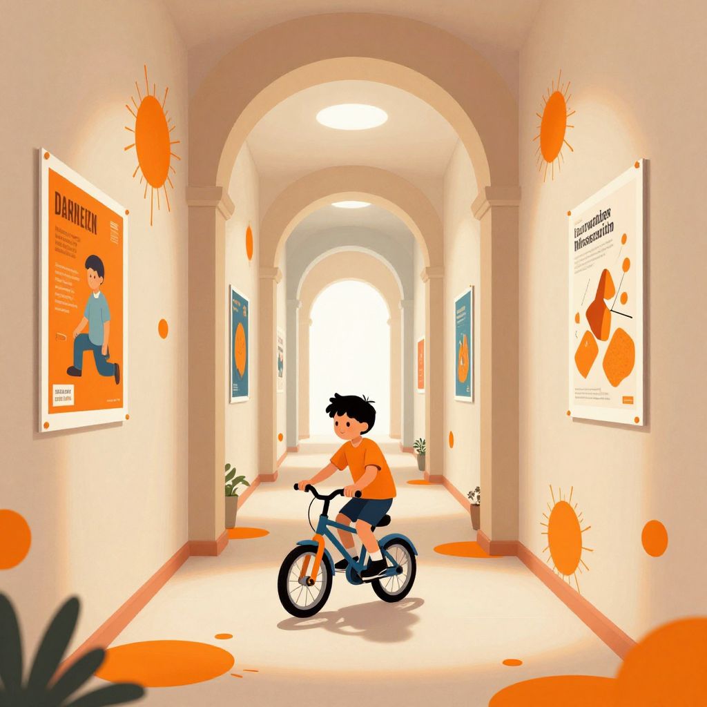 Digital illustration of a young boy with short black hair, wearing an orange shirt and blue shorts, riding a blue bicycle down a brightly lit, arched hallway. The walls are adorned with posters; one on the left shows a boy in a similar outfit, and the right poster features abstract orange shapes. Orange splatters decorate the walls and floor, adding a playful touch. Potted plants are placed in the corners, and sunlight streams through an archway at the end of the hallway, creating a warm atmosphere. The style is vibrant and cartoonish.