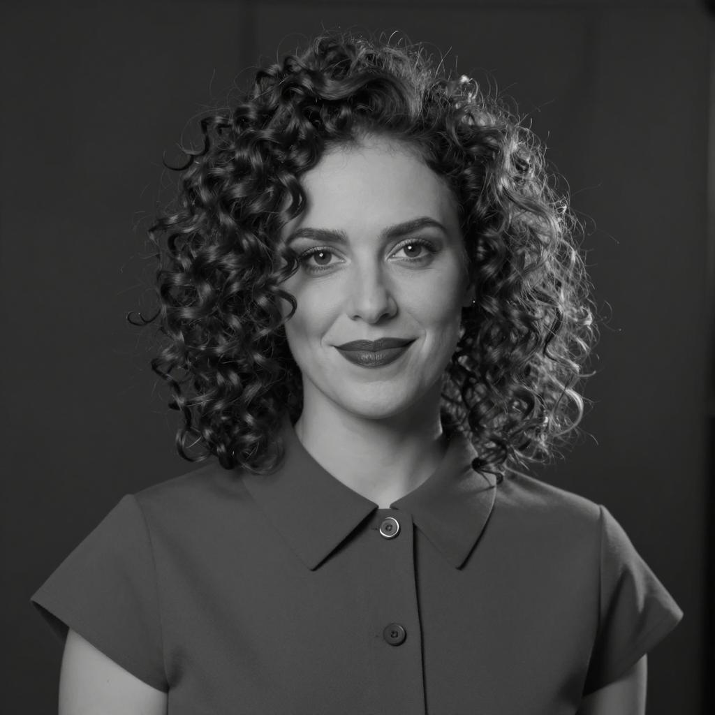 Black and white photograph of a woman with curly, shoulder-length hair, wearing a collared dress. She has dark lipstick and makeup, with a slight smile. Background is dark and blurred. She is facing forward.