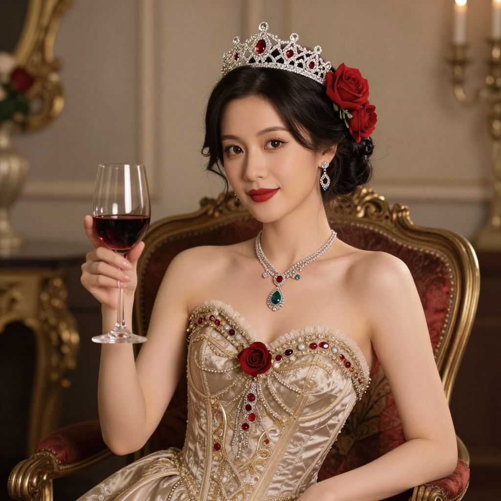 Photograph of an East Asian woman with fair skin and black hair styled in an elegant updo, wearing a silver tiara adorned with red roses. She has red lipstick and is dressed in a strapless, cream-colored corset gown with intricate gold embroidery and red rose embellishments. She holds a glass of red wine in her right hand, her left adorned with a green gemstone necklace and matching earrings. She sits in an ornate, red velvet chair with gold trim, set against a luxurious, dimly lit background with candle sconces and classical decor. The overall style is regal and sophisticated.