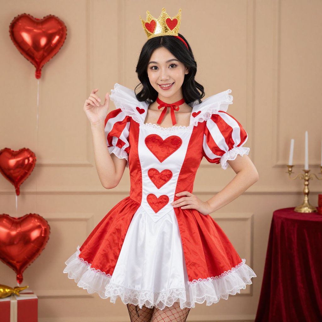 Queen Hearts Fancy Dress Costume, dressed in a costume with hearts on it