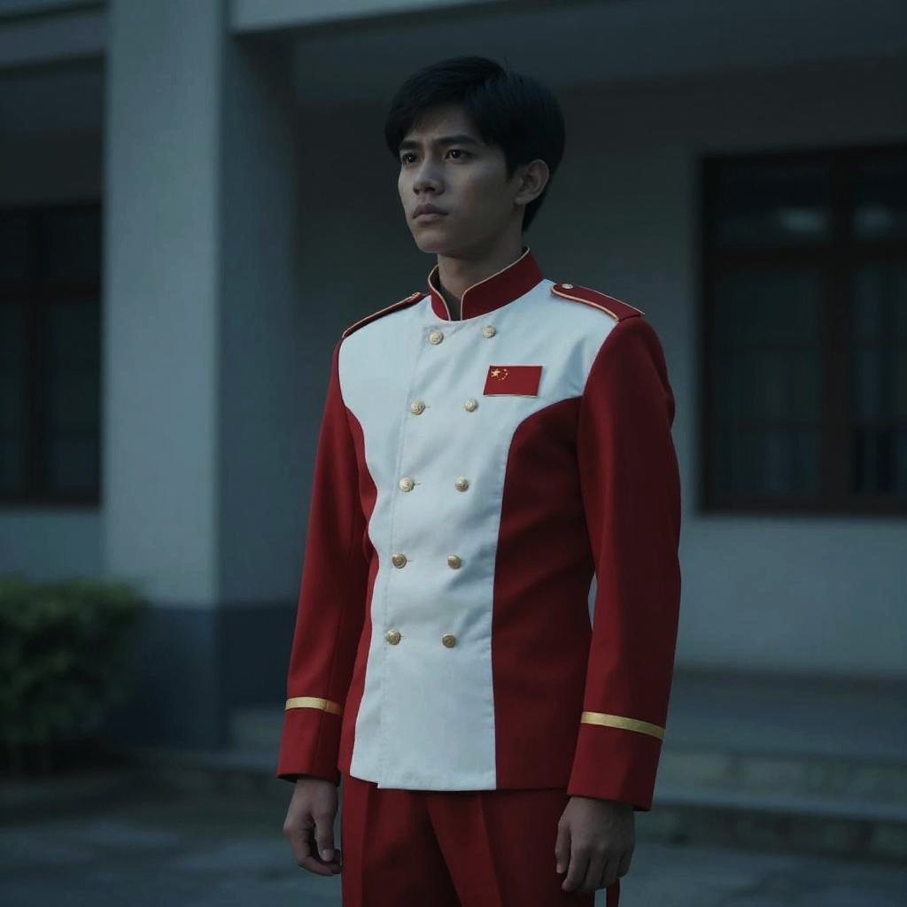 Pinoy Heroes Costume, man in a red and white uniform standing in front of a building --sref 1438