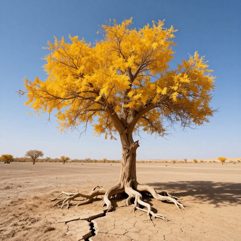 Photograph of a solitary, tall tree with bright yellow, dense foliage standing in a barren, sandy desert. The tree's thick, twisted trunk and exposed, gnarled roots are prominent. The clear blue sky contrasts with the yellow leaves and beige sand. In the background, a few smaller trees are scattered, adding depth to the arid landscape. The sunlight casts sharp shadows, emphasizing the tree's texture and the desert's dry, cracked surface. The overall composition highlights the tree's resilience against the harsh environment.