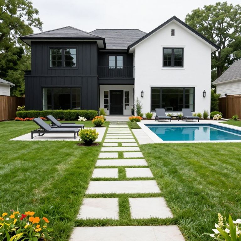 Lush green lawn interspersed with geometric white stone pathways leads to a modern two-story home featuring a sleek black-and-white exterior, flanked by neatly trimmed hedges and vibrant flower beds, while a tranquil rectangular pool with sun loungers invites relaxation in this serene Arlington Heights, Illinois, retreat.