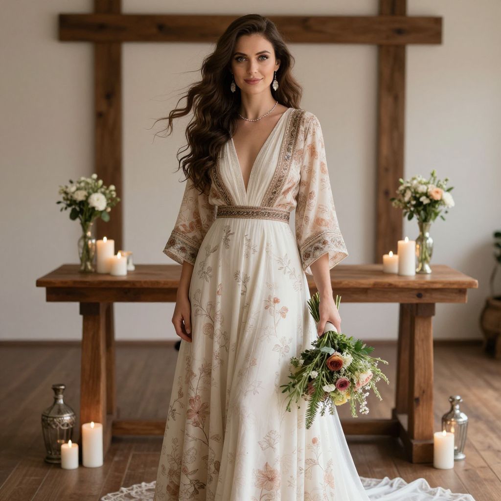 A stylish and elegant photo of a bride in a fashionable day two wedding costume, dressed in a modern, bohemian-style outfit with earth-toned floral print, standing at a rustic wooden wedding altar surrounded by candles and vintage decor, her long brown hair flowing naturally, with expressive green eyes and a serene smile, holding a bouquet of fresh wildflowers.