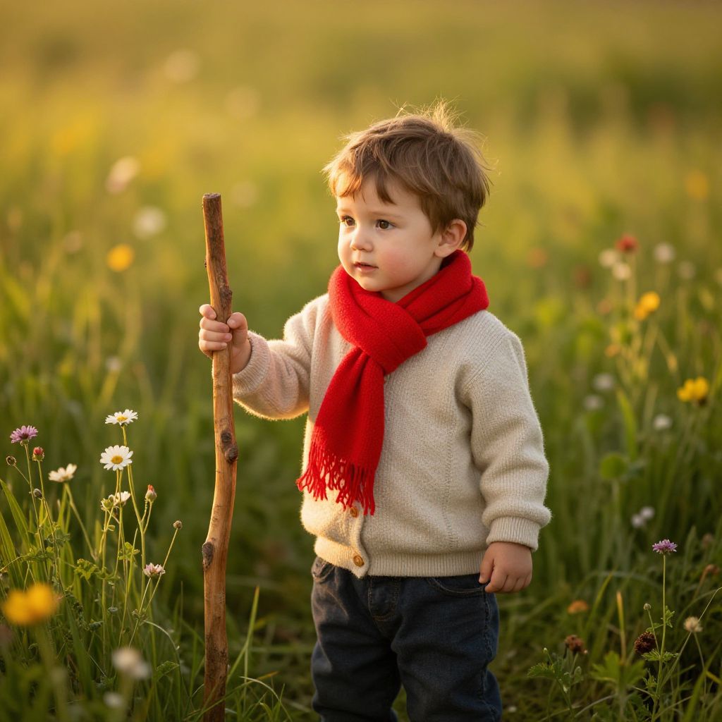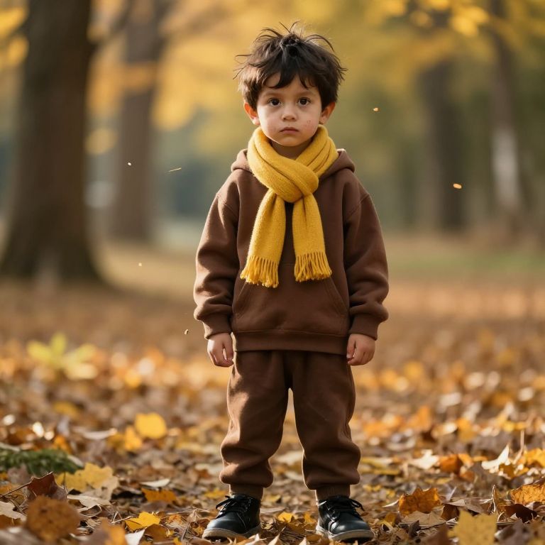 A young boy with messy dark hair and a serious, focused expression is wearing a brown hoodie with a yellow scarf wrapped neatly around his neck. He has a slightly weathered face, with wide, curious eyes that convey determination. He is wearing black leather shoes and stands confidently in a quiet, autumnal forest clearing, with golden leaves gently falling around him. The scene is softly lit by the warm afternoon sun, capturing both the warmth of the moment and the boy's quiet intensity.