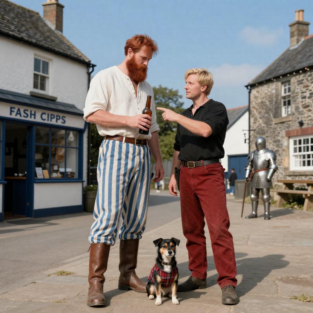 Photograph of two middle-aged men and a small white dog. The man on the left has blonde hair, a mustache, and wears a black tunic with a belt. The man on the right has red hair, a beard, wears a horned helmet and a blue and white striped costume. The dog sits on the right man's arm. Both men have intense, surprised expressions. Background: wooden cabin interior with stairs.