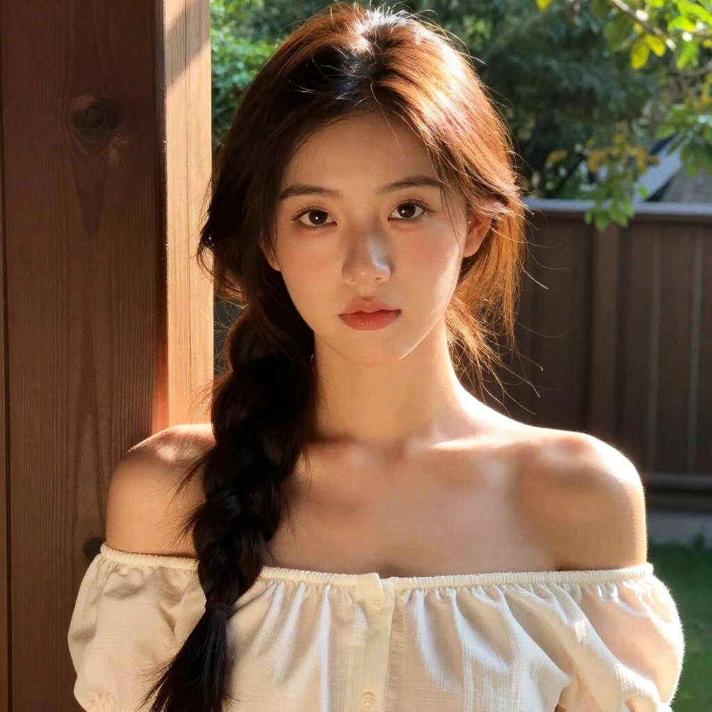 Photograph of a young woman with light brown skin and long brown hair in a side braid, standing near a wooden wall. She wears a light-colored, off-shoulder top. Sunlight illuminates her face and upper body. Background includes greenery and a wooden fence. Her expression is calm and slightly serious.