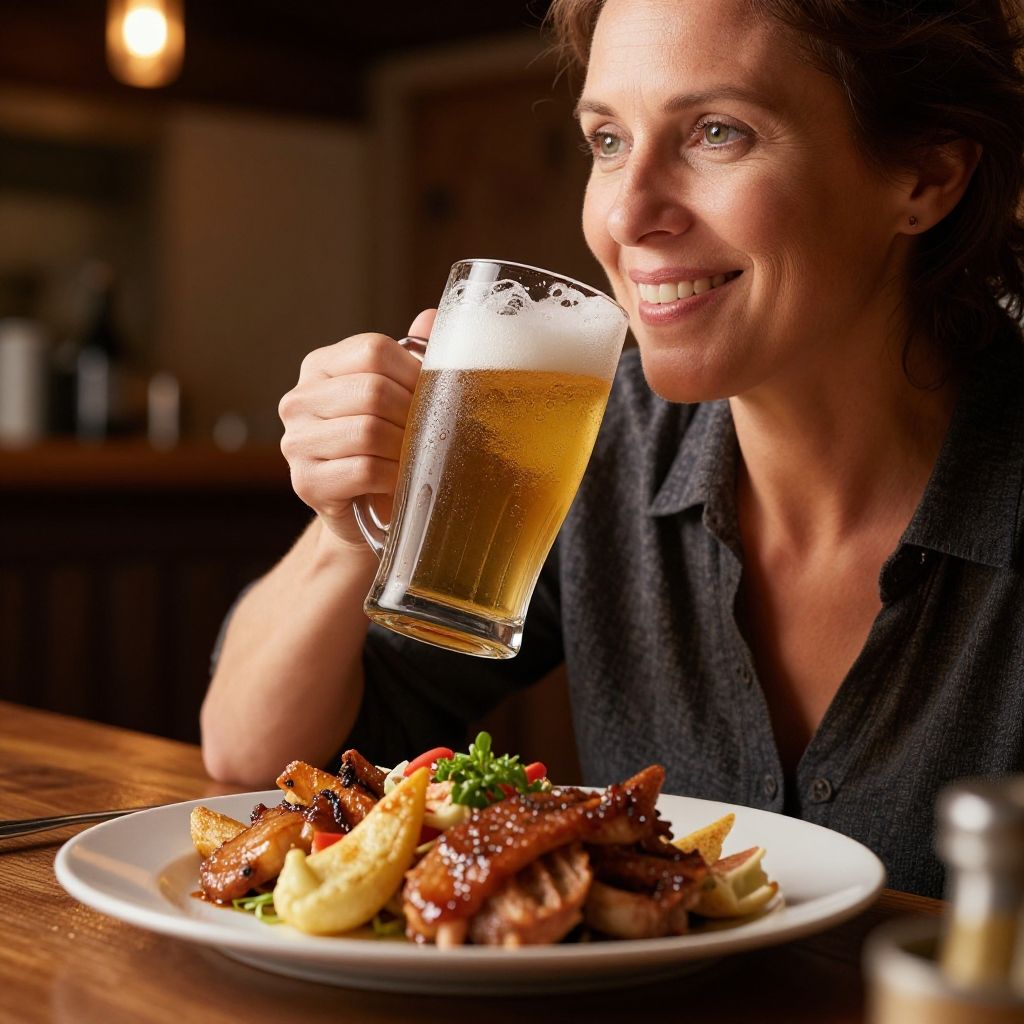 (masterpiece), (best quality), (ultra-detailed), gourmet food and smiling person photo of high resolution, detailed, realistic, a middle-aged woman enjoying a cold beer, cheerful expression, holding a beer mug with both hands, sitting at a traditional wooden bar, ambient lighting, warm atmosphere, rustic interior background. soft natural lighting, macro details on food, vibrant colors, fresh ingredients with glistening textures, bokeh background that suggests a cozy kitchen or dining setting, styled plating harmonizing with the person's attire, wooden tabletop, food garnished and looking tantalizing, the person appearing engaged and enjoying the meal, editorial quality, detailed eyes, perfect composition, moist skin, intricate details
