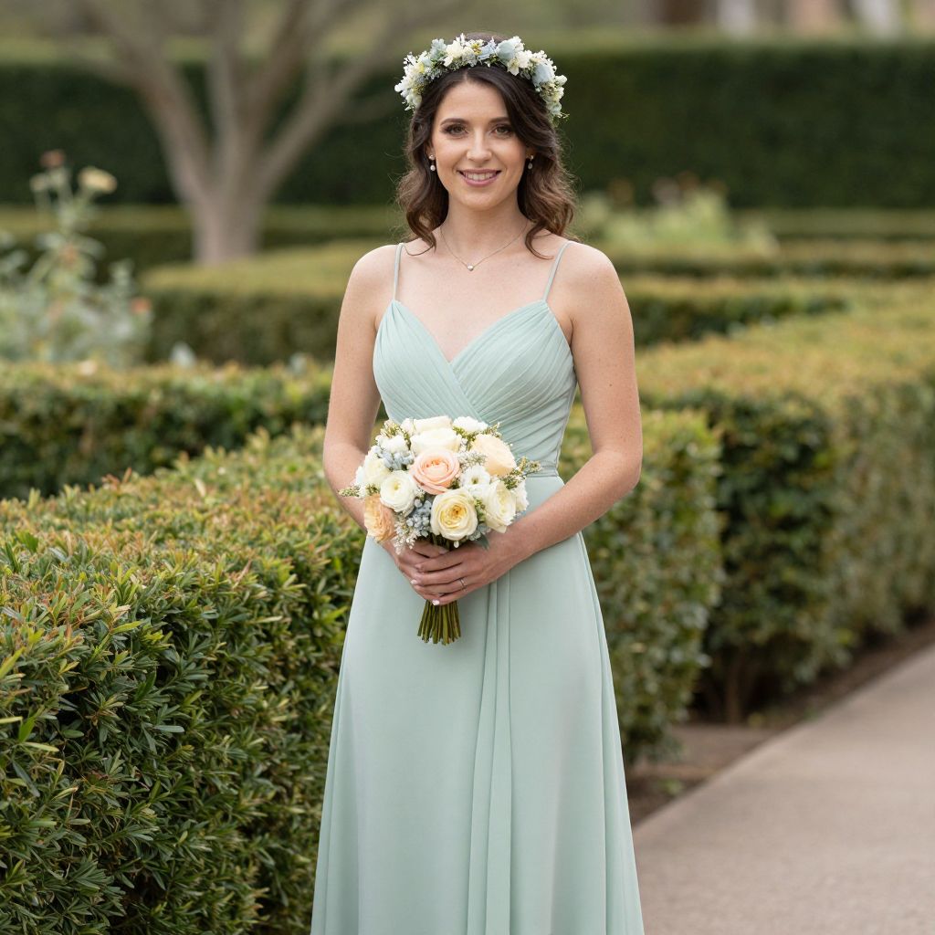 Moss-green bridesmaid dress elegantly paired with a delicate floral halo crown and a soft pastel bouquet, held gracefully by a smiling woman standing amidst manicured hedges in a serene garden setting.