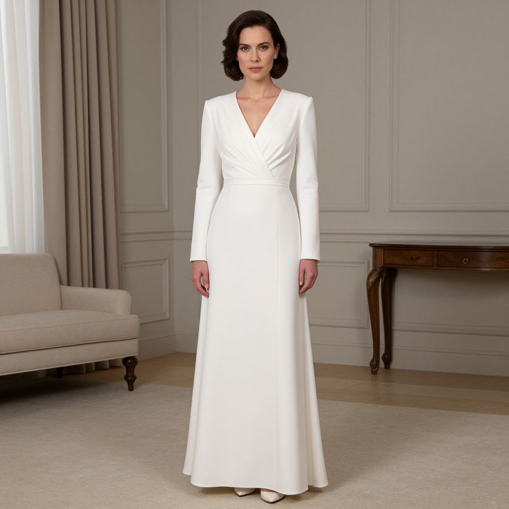 Photograph of a dark-haired woman in a long-sleeve, V-neck white wedding dress standing in a elegant, light-colored room.