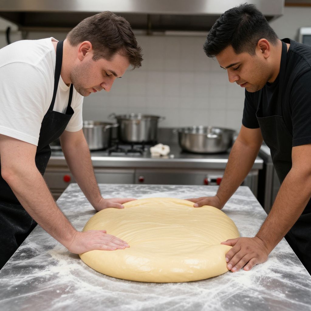 Photograph of two male chefs, one Caucasian with short brown hair in a white shirt and black apron, the other Latino with short black hair in a black shirt and black apron, working together in a modern kitchen. They are rolling out a large, pale yellow dough on a silver, flour-dusted countertop. In the background, there are stainless steel pots and pans on a stovetop with a white tiled wall. Both chefs are focused and their hands are placed on the dough, indicating they are in the process of preparing it. The kitchen is well-lit with natural light.
