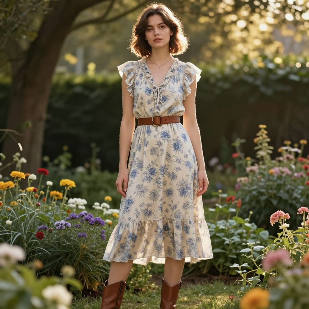 A young woman with short, sun-kissed brown hair that softly glows in the golden sunlight, wearing an elegant cream and blue floral dress with delicate ruffles and a subtle sheen, secured at the waist by a refined brown leather belt. Her styled brown leather boots add a touch of charm and modern edge, enhancing her confident and poised demeanor. She stands gracefully in a softly lit garden setting, surrounded by lush green foliage, vibrant blooming flowers, and gentle dappled sunlight filtering through the trees. The atmosphere is warm, natural, and inviting, with a quiet elegance that exudes both beauty and calm presence.