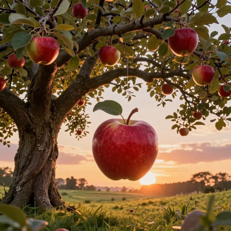 Newtons apple falling in an ancient orchard, surreal sunset background, soft ethereal light, intricate detail in trees and fruit, vivid colors, scientific discovery theme, hyper-realistic style blending fantasy and realism