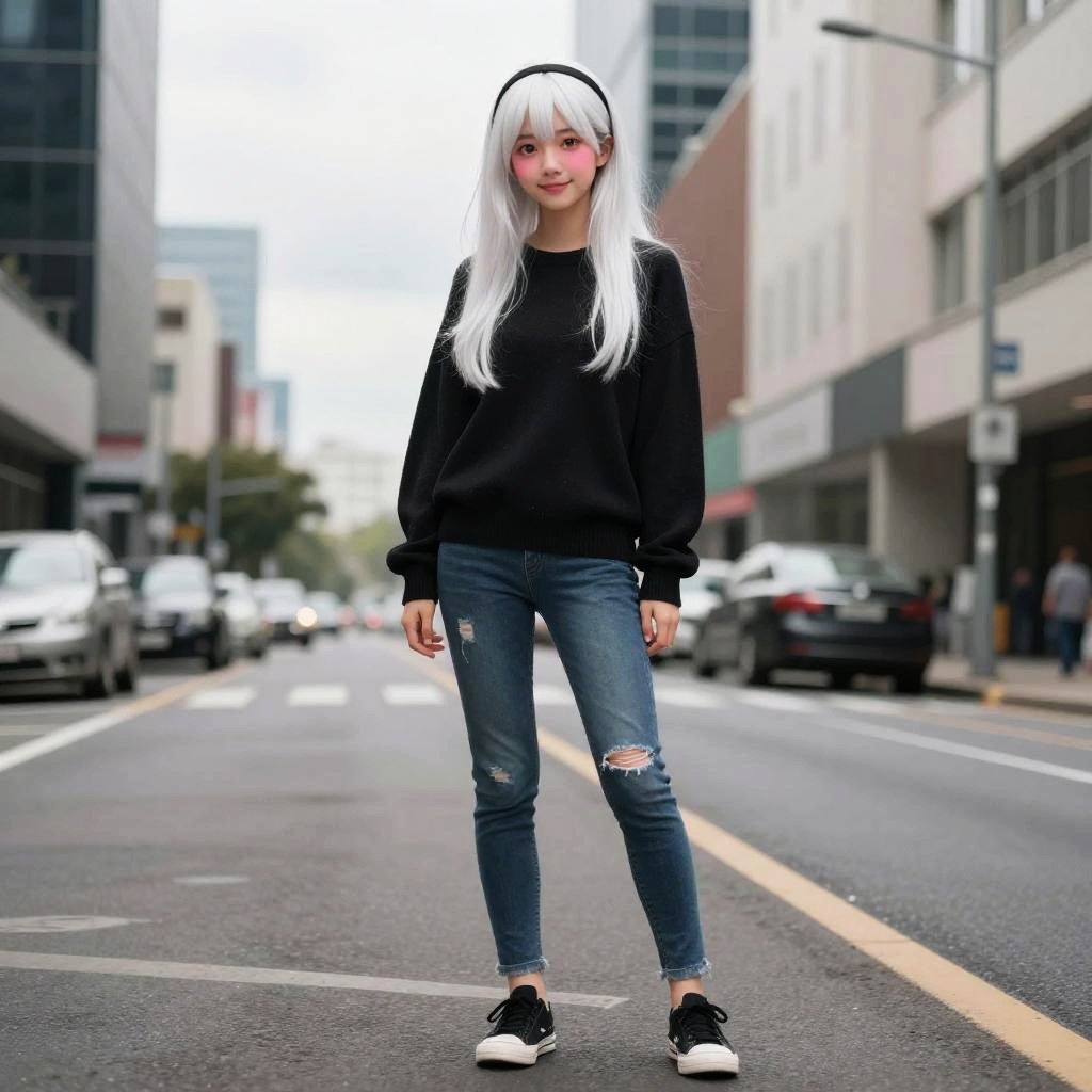 (RAW photo, best quality), (realistic, photo-realistic:1.3), masterpiece, extremely detailed, CG, unity, 2k wallpaper, Amazing, finely detail, light smile, extremely detailed CG unity 8k wallpaper, huge filesize, ultra-detailed, highres, absurdres, soft light, 1 girl, (black sweater:1.2), solo, (18yo), cute, round eyes, pink blush, Long hair, (white hair:1.1), (hairband:0.9), skinny jeans, (ripped jeans:1.2), black sneakers, standing, street corner, urban background, cloudy, cool colors, (leading lines composition:1.3), natural lighting, anime style.