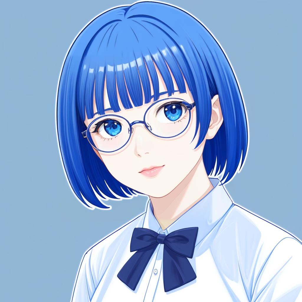 Hakamichi shizune, katawa shoujo, 1girl, blue eyes, glasses, semi-rimless eyewear, short hair, blue hair, yamaku high school uniform, yamaku high school uniform, white shirt, black bowtie, blouse, by artist mashima shima, anime