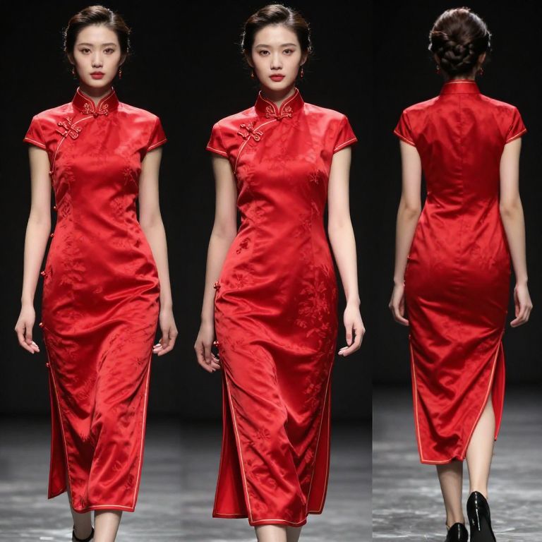 Photograph of an East Asian woman modeling a vibrant red satin cheongsam dress with short sleeves and a high collar, adorned with floral embroidery. The dress has a fitted waist and a slit on the right side. She is shown from three angles: front, side, and back. Her black hair is styled in a neat updo. The background is dark, emphasizing the dress's shimmering texture. She wears black shoes. The lighting highlights the dress's glossy fabric, creating subtle reflections. The model's expression is neutral, and she walks confidently on a gray, slightly reflective runway.