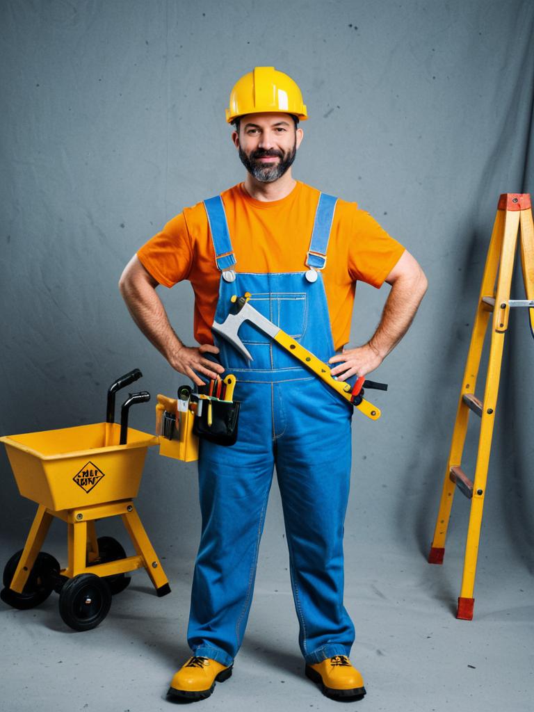 Man in Bob Builder Costume, cinematic realism, playful editorial cosplay photo