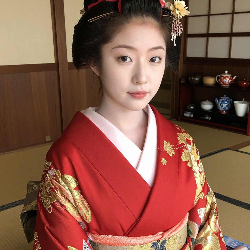 Photograph of a young Asian woman with pale skin, black hair in an elaborate updo, wearing a vibrant red kimono with gold floral patterns,