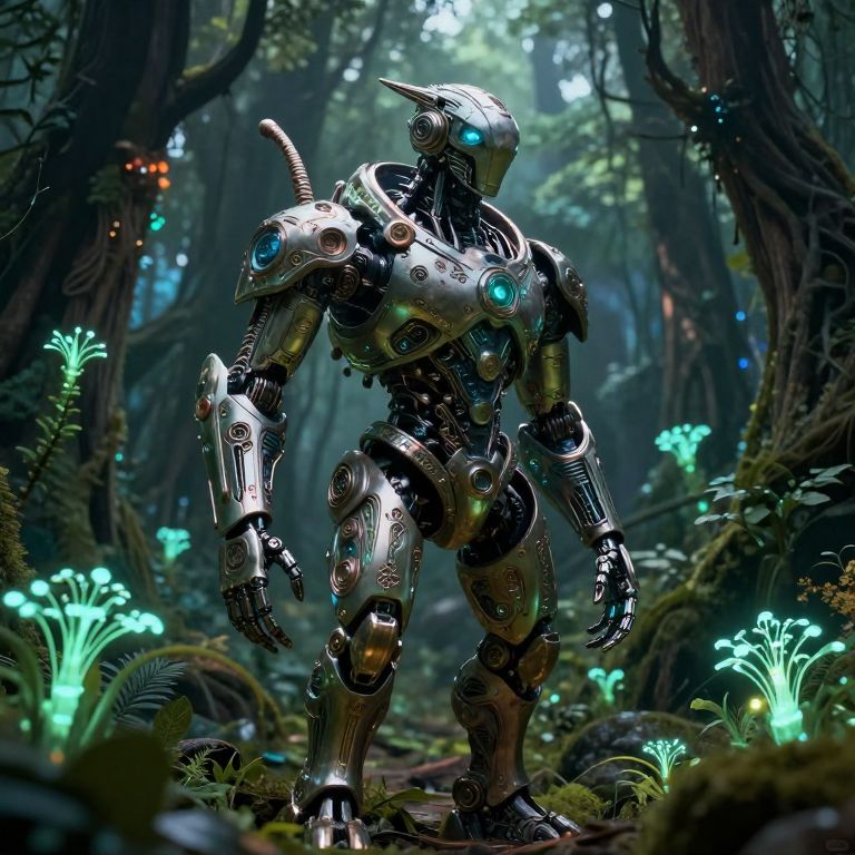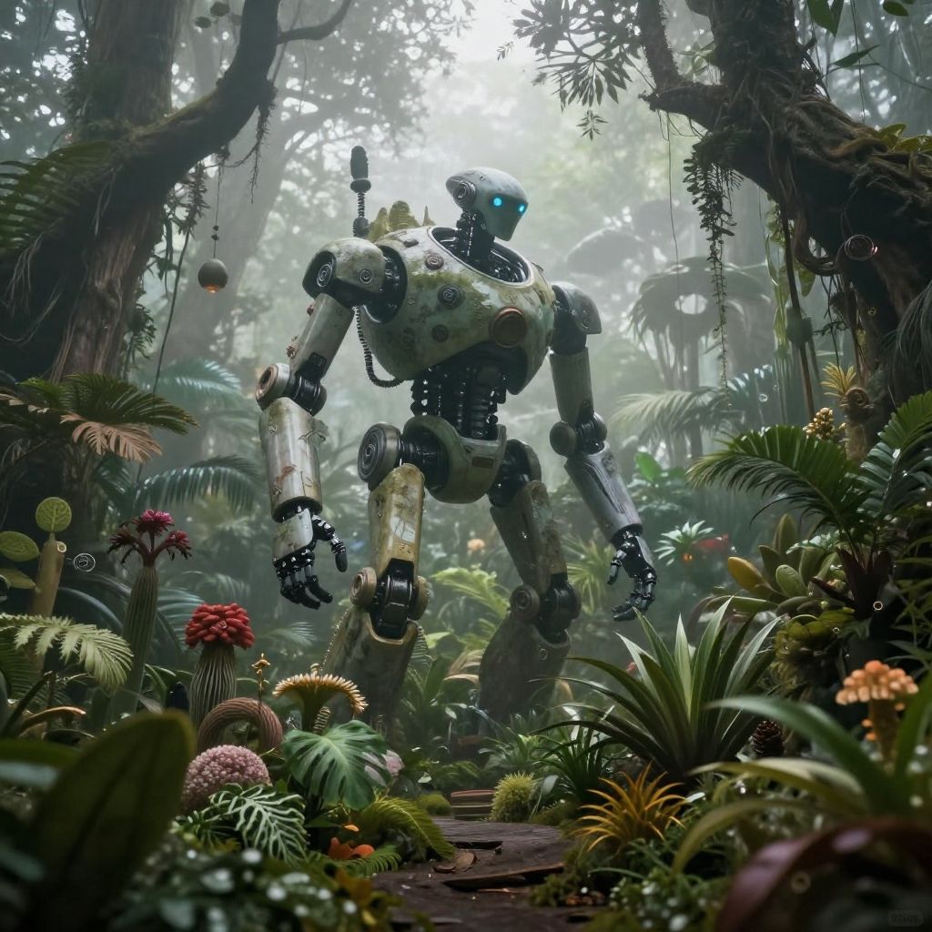Stylized by Sparth, Etam Cru, digital art, landscape of a Authentic Botanical garden from inside of a Feywild forest, Foggy conditions, Lowbrow Art, cinematic lighting, Short exposure, Sony A7, Depth of field 100mm, Swirling Tweed, robot, complex artistic color composition, imposing, best, located artistic, winning, exquisite color, gorgeous