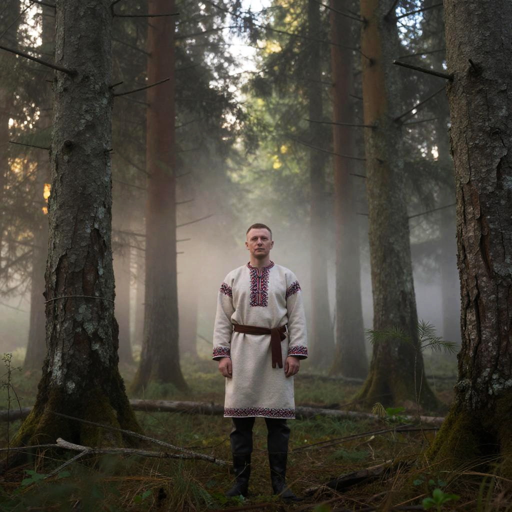 Borovikov standing in a dense mystical forest at dawn, ethereal light filtering through ancient towering trees, soft mist swirling at his feet, wearing traditional Slavic clothing, intricate embroidery and natural earth tones, hyper realistic, cinematic atmosphere.