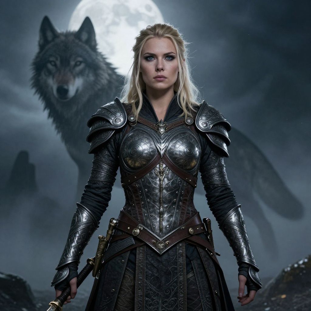 A striking, hyperrealistic full-body portrait of a warrior woman with blonde hair, blue eyes, and intricate armor, set against a dramatic, moonlit, foggy background with a wolf shadow and a divine, cinematic lighting.