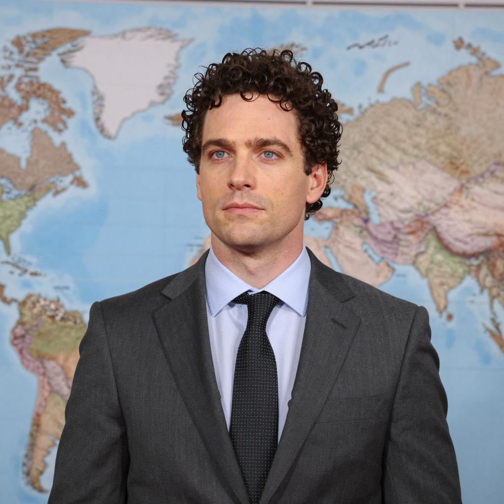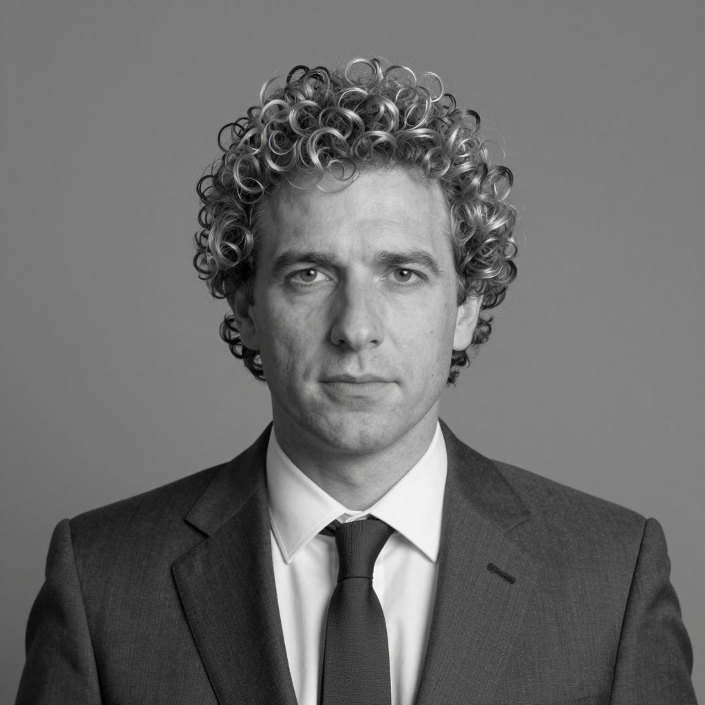 Photograph of a man with curly blonde hair, wearing a dark blue suit and tie, smiling broadly with teeth showing. His head is tilted slightly to the right. Background is a clear, light blue sky with a distant, blurry landscape.