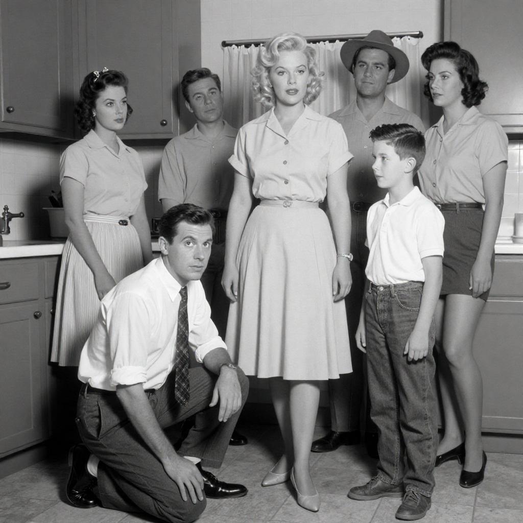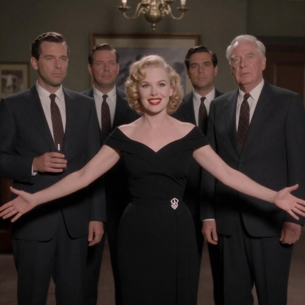 Photograph of a mid-20th century movie scene. Central blonde woman with short curly hair, black dress, outstretched arms, smiling. Four men in dark suits with white shirts and ties, standing behind her. Background includes a chandelier and framed picture. Woman's dress has a white emblem on the front. Men have neutral or serious expressions. One man on the left holds a drink in his left hand. One older man on the right has white hair. Dim, indoor lighting.