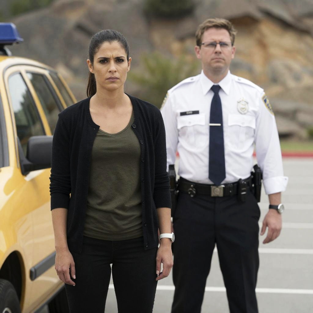 Photograph of three people beside a police car. Man with red curly hair, brown jacket, talking on phone, leaning on car. Woman with brown hair, green coat, standing near open car door, looking forward. Older man with gray beard, police uniform, standing to the right. Urban apartment building background. Intense expressions.