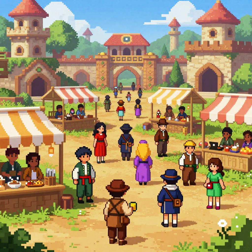 Pixel anime scene of a bustling marketplace in a fantasy world, diverse characters in colorful outfits, intricate pixel art architecture, lively atmosphere with bright daylight.