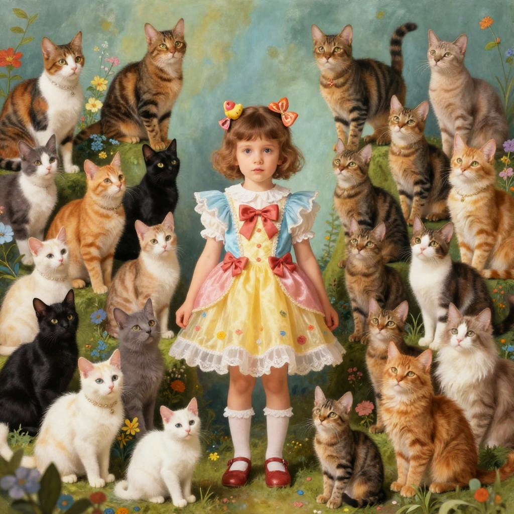Digital painting: Curly-haired girl in blue dress with red bow, surrounded by colorful cats in sunlit, flower-filled meadow. White cat on