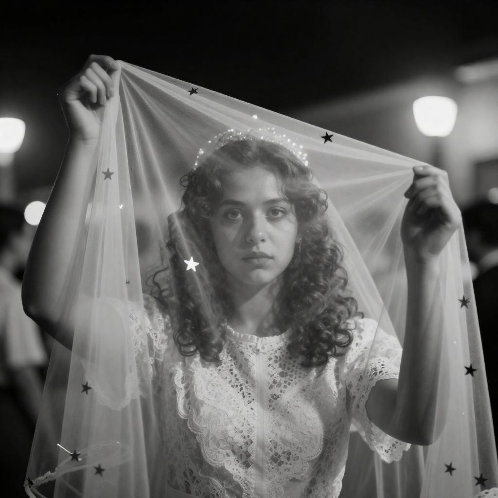 Black-and-white photograph of a young woman with curly hair wearing a detailed lace dress and a large, star-adorned veil. She holds the veil up with both hands, her expression serious. Blurred lights and indistinct figures are in the background. The image has a vintage, dramatic feel.