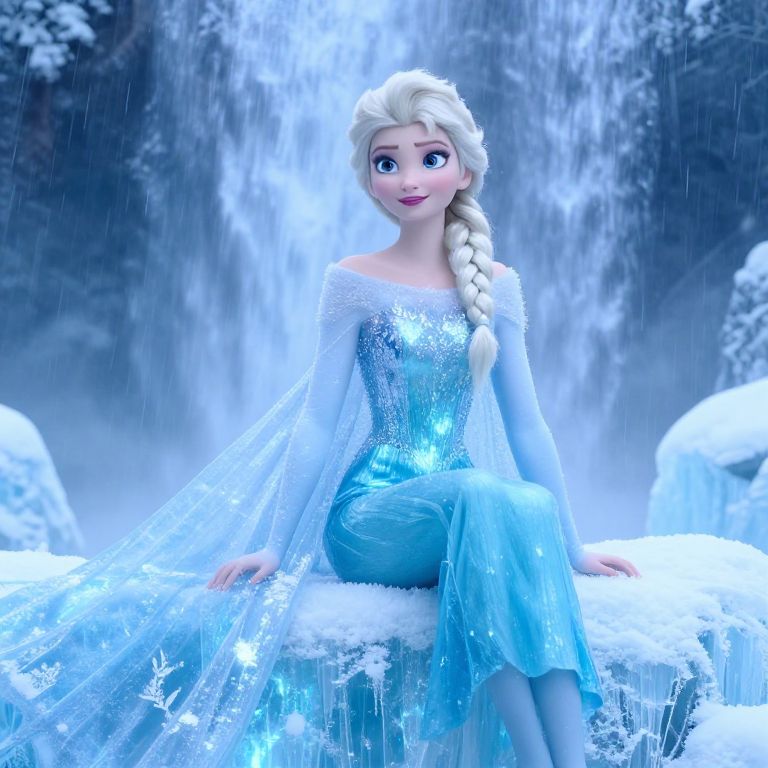 Digital CGI of Elsa from Frozen, sitting on icy rocks, wearing a sparkling blue gown with long braid, in front of a cascading waterfall.
