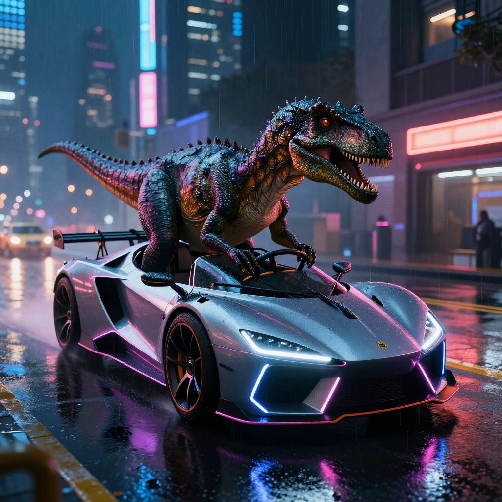 SpongeBob driving a sleek, silver supercar underwater, neon lights glowing, futuristic cityscape with bubbles and jellyfish in the background.