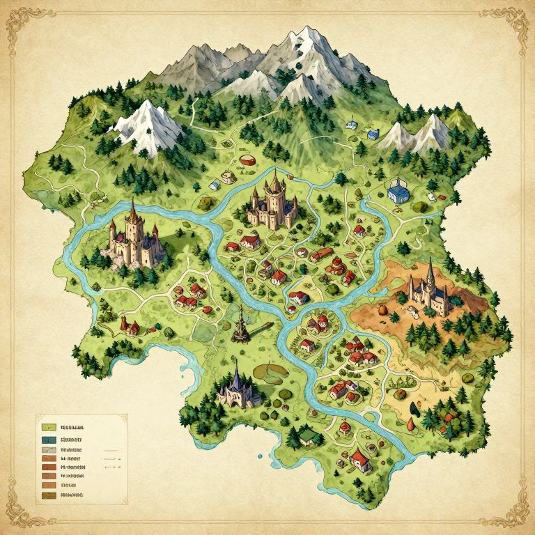 Map:couahcwer00= fantasy world map with diverse terrains including mountains, forests, rivers and castles, rich watercolor style, hand-drawn look with detailed icons for villages and landmarks, parchment background with decorative border