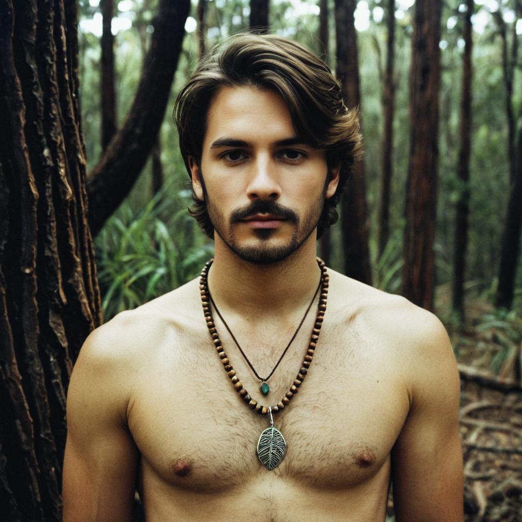 Squints costume sandlot,1boy,male focus,solo,facial hair,jewelry,black hair,realistic,necklace,beard,tree,outdoors,blurry,blurry background,mustache,arms behind back