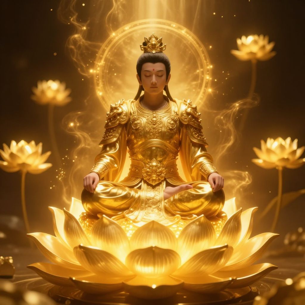Photograph of a blue-painted statue of a serene Buddhist monk with a shaved head, wearing a maroon and yellow robe, adorned with a jeweled crown and large, intricate earrings. The monk has a red dot on his forehead and a detailed medallion necklace. Two glowing, translucent jellyfish hover on either side of his head, their bioluminescent lights contrasting with his blue skin. The background features an ornate, circular, gold-patterned design, adding a sense of depth and richness to the image. The overall style combines traditional Buddhist iconography with a surreal, modern twist.