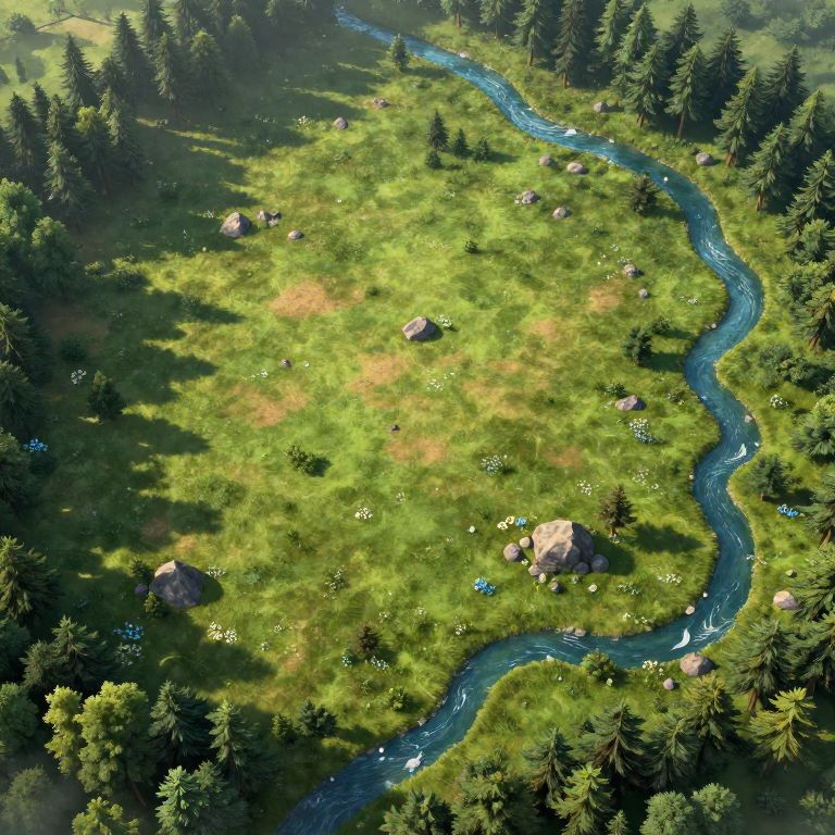 Dnd open field map featuring an expansive grassy plain bordered by dense forests, a crystal-clear river cutting through the center, scattered boulders and wildflowers, morning light casting long shadows, high detail, perfect for fantasy role-playing sessions