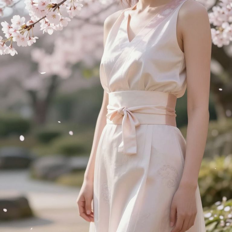 Slim waists wrapped in delicate silk sashes, standing in a sunlit Japanese garden with cherry blossoms falling gently, soft pastel tones, dreamy atmosphere, detailed textures on fabric and skin.