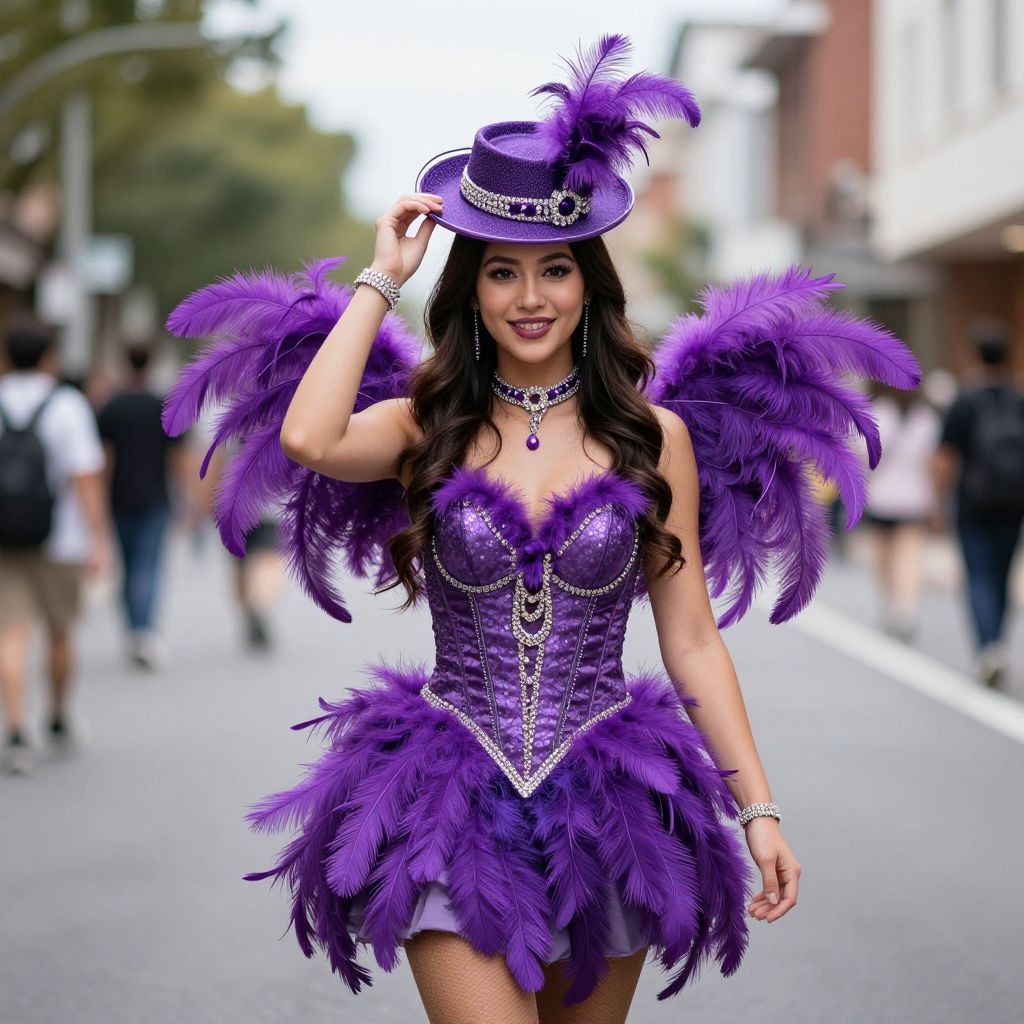 Purple Carnival Costume, purple dress with feathers and a purple hat on a street
