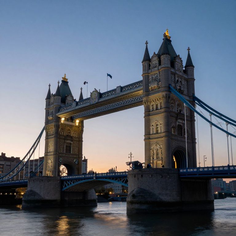 Photograph of London's Tower Bridge at dusk. The bridge's two prominent stone towers, adorned with spires and intricate details, are illuminated by warm lights, contrasting against the deepening blue sky. The bridge's suspended section and blue cables are also visible. The river below reflects the bridge and sky's colors. In the background, the city's buildings are dimly lit, adding to the evening ambiance. The flag on the right tower is slightly visible. The overall mood is serene and majestic, highlighting the bridge's historic architecture and the city's tranquil evening atmosphere.
